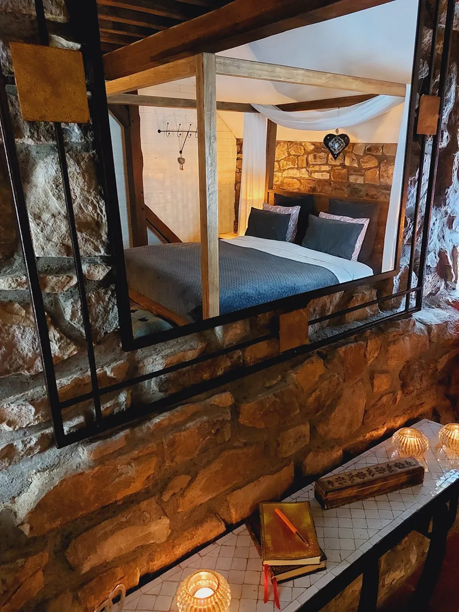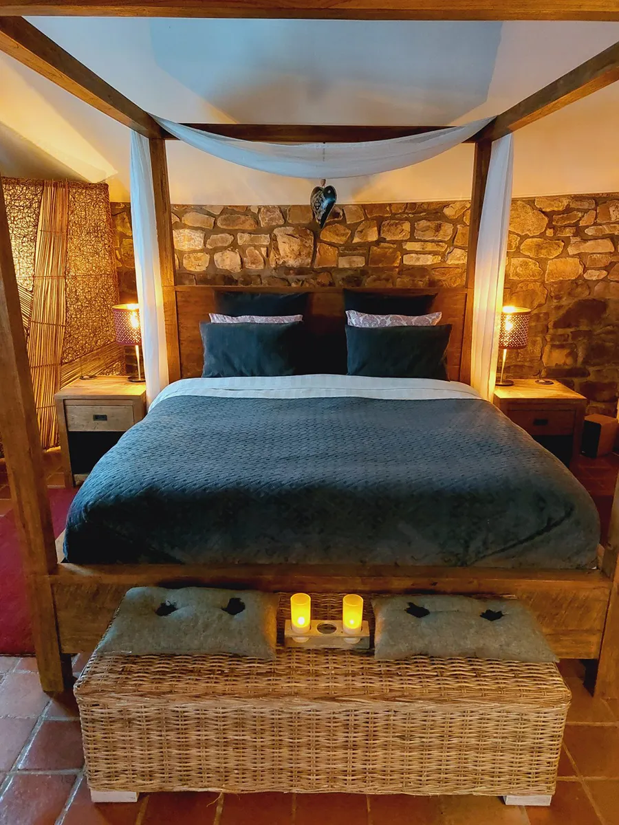 - Une chambre : lit double à baldaquin, literie somptueuse complète comprenant draps et édredon, 2 coussins de sommeil