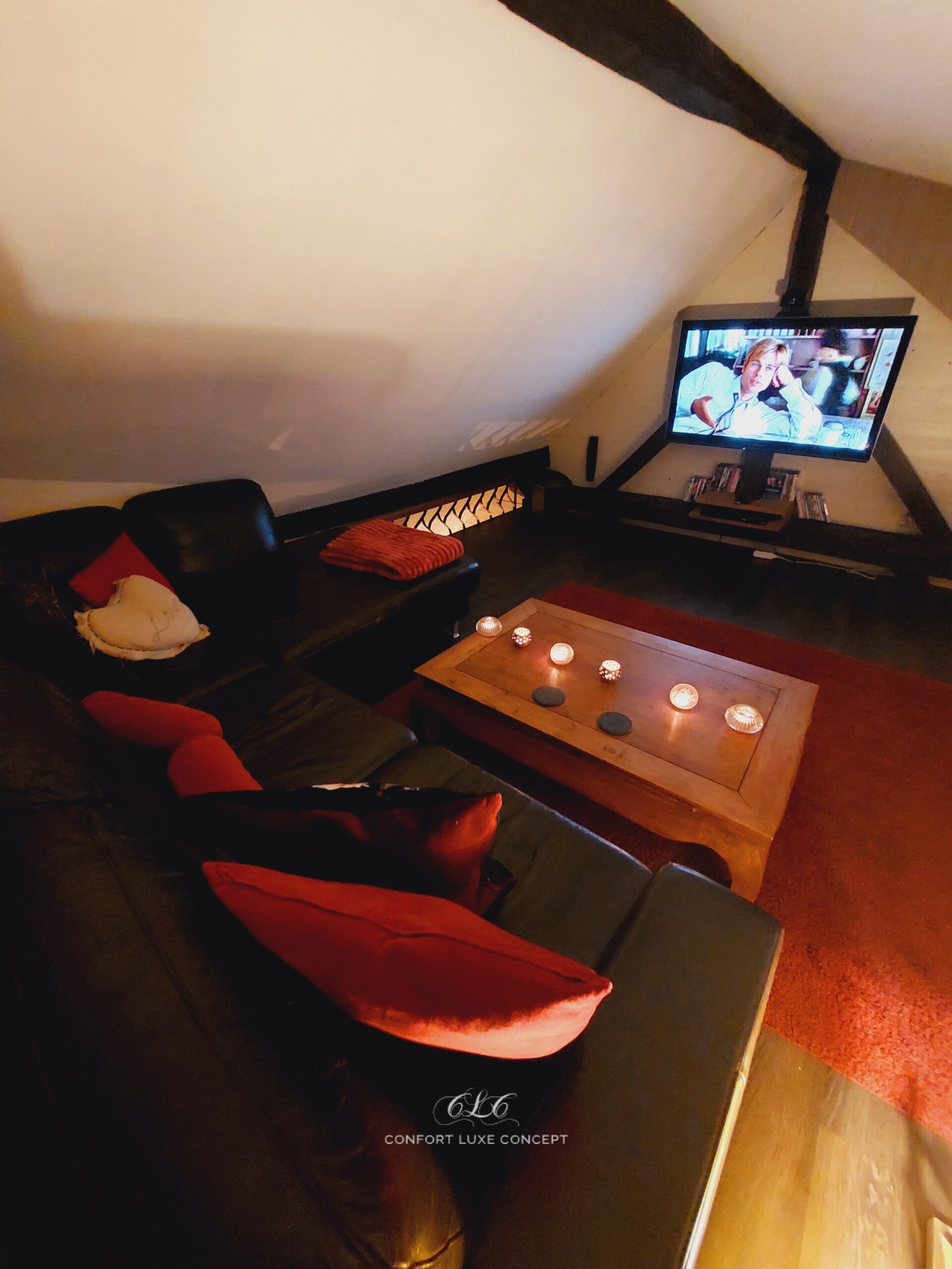- Un salon : divan en cuir, grand écran 3D avec une sélection de DVD’s à disposition et un lecteur CD/DVD